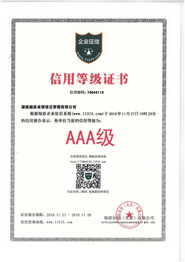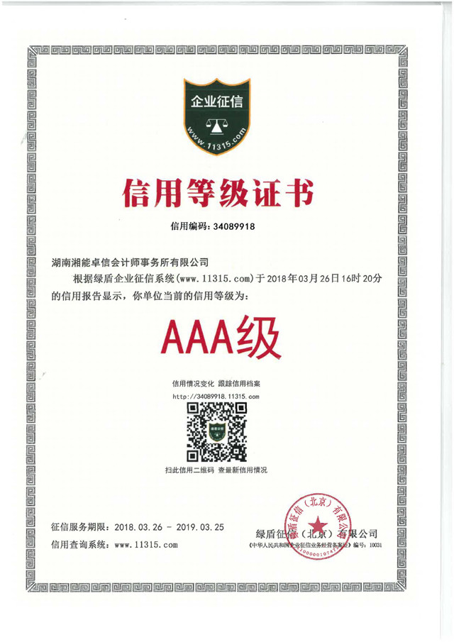 近日,湖南湘能卓信項(xiàng)目管理有限公司及湖南湘能卓信會(huì)計(jì)師事務(wù)所有限公司獲得了由綠盾企業(yè)征信系統(tǒng)出具的企業(yè)征信信用等級(jí)“AAA”證書(shū)。